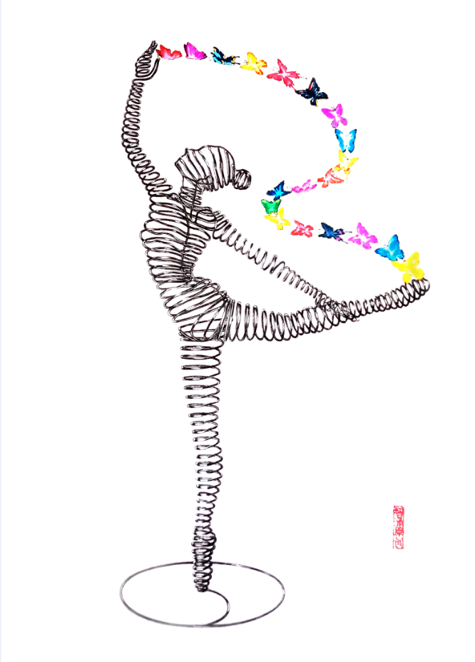 两根钢筋线回环缠绕形成一个镂空的三维人体,它可以做成实物雕塑,如图五现代工艺品《福报》 (我用钢筋做的女靴,不锈钢彩绘作的蝴蝶,摸索出了这类制作经验)
