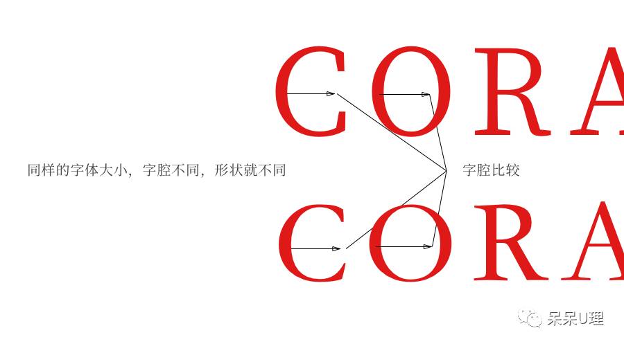 C 和 O 这种字母中间的空间被称为「字腔」,「字腔」较宽就会给人轻松、自由的感觉;「字腔」窄,就会显得很密集、具有力量的感觉。