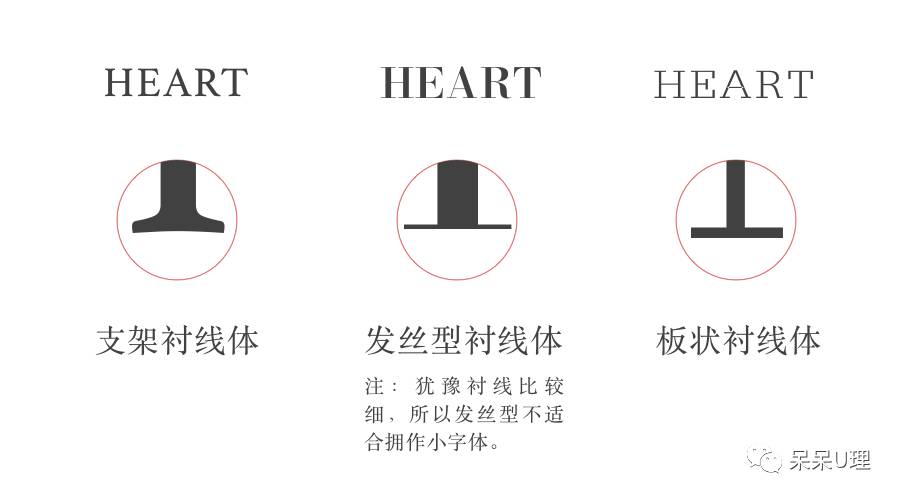 如果要继续细分,衬线体还可以被分为三种类型:支架型衬线体、发丝型衬线体、板状衬线体;而我们今天看到的大部分衬线体都是板状衬线体,同时也是旧体的一种。