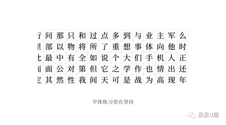 这样进行大概一周时间(我是一周,每天临摹 5 个宋体字,要非常仔细),开始继续去理解字体的其他知识(在这期间,临摹字体是不能中断的)。如字体排版、字重、字间距和行间距等等,然后再继续练习,理论结合实践,进步就会非常快。