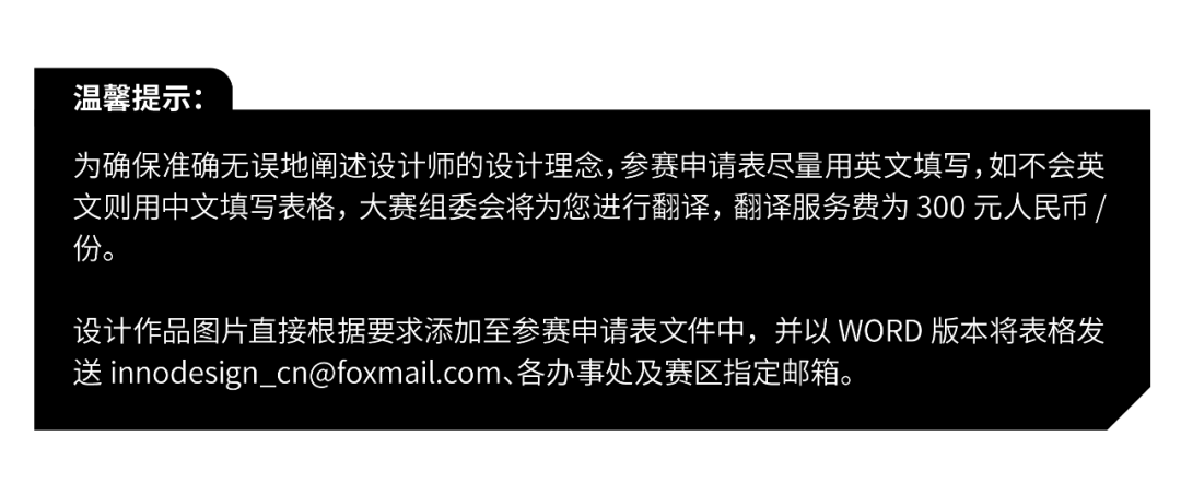 关于大赛更多详细信息,可浏览大赛中方官网:http://www.innodesignglobal.com/,如有疑问,可添加大赛官方微信INNODESIGN_CN咨询。