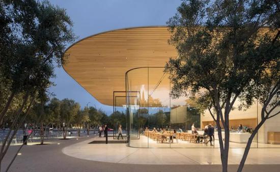 Apple Park访客中心就在乔布斯剧院的不远处,从透明的曲面玻璃,到整洁的围栏,从木质天花板的细小吸音孔到精致的消防器材仓门,这些都体现着苹果对细节的控制。玻璃幕墙与碳纤维屋顶无缝衔接,风光无限。
