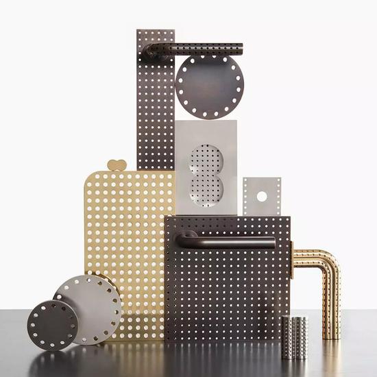 Stardust系列门把手的18luck新利全站 非常的工业范儿,这些把手都是在布鲁塞尔纯手工制作,独特的“双零”图案,手柄和旋钮处都有重叠的圆形穿孔。