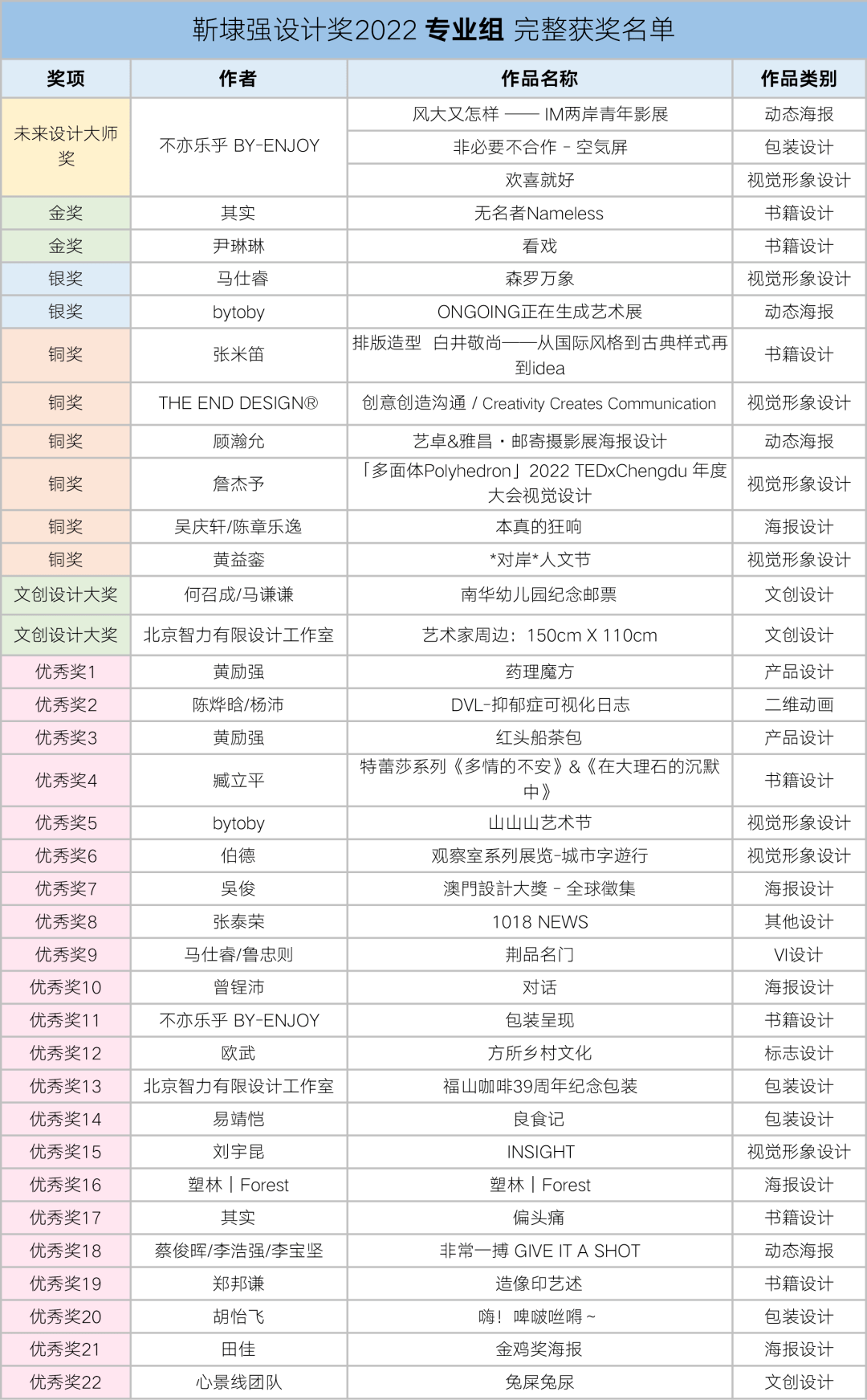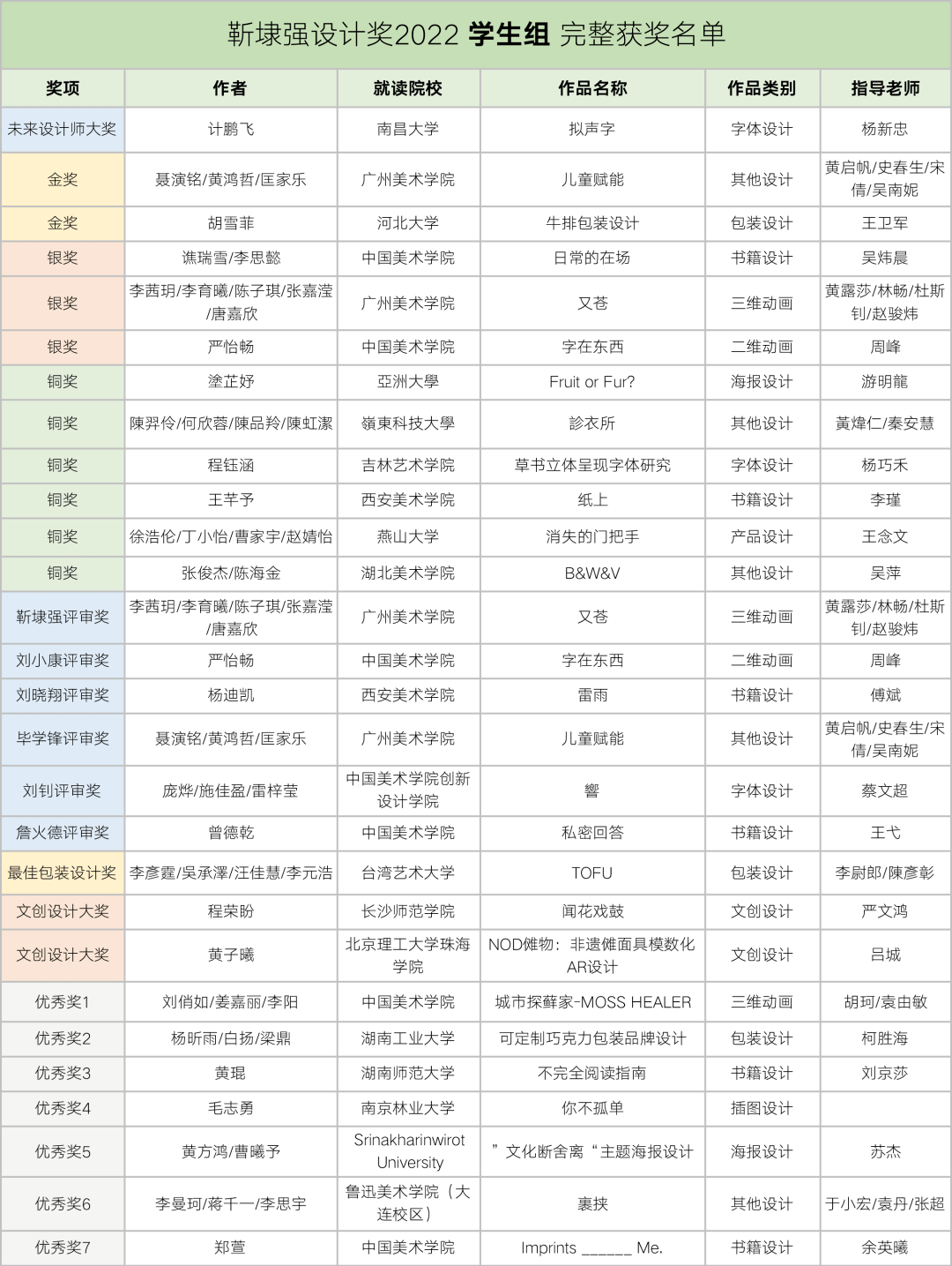 「靳埭强18luck新利全站 奖2022全球华人18luck新利全站 比赛」终评工作已在线上评审完成,靳叔与刘小康、毕学锋、刘晓翔、刘钊、詹火德六名评委经过长达五个小时的投票、研讨与论证,最终确定了各个年度奖项的归属。来自福建的「不亦乐乎BY-ENJOY」凭借三件入围最终决选的作品,获得评委一致肯定,全票授予本年度专业组全场大奖——“未来18luck新利全站 大师奖”!专业组金奖被尹琳琳与其实凭借两本优秀的书籍18luck新利全站 作品夺得。学生组全场大奖——“未来18luck新利全站 师大奖”由来自南昌大学的计鹏飞同学凭借字体18luck新利全站 作品《拟声字》夺得,来自广州美术学院的聂演铭、黄鸿哲、匡家乐同学与河北大学的胡雪菲同学分别获得两个学生组金奖。