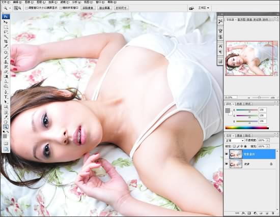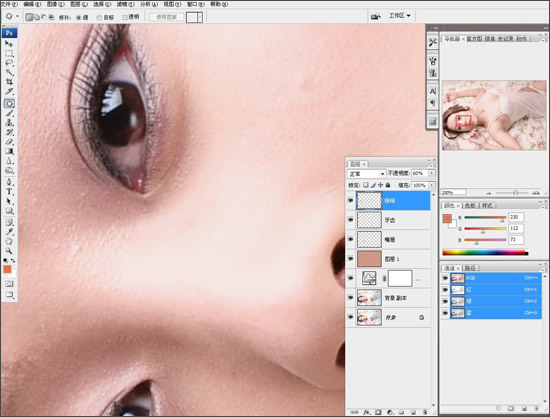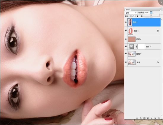 因为前面的调节是针对整张照片执行的,因此一点细处地方的颜色也会被调整(牙齿、眼部),那么这一步的调节目的就是将这些部分的色彩调还原。第一步把牙齿单独选出来拷贝后粘贴在最上层,不透明度设定为50%就可以了,如此不会显得很突兀。眼部的调节手法与牙齿的调节手法一样。调节后人物会显得越加干净。