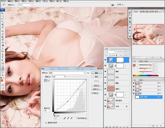 第一步执行区域调色。新建“曲线”调节图层,减蓝、减绿、加红,之后把相片的整体亮度略略增加,调节后的相片feel颜色越加浓郁。整体查看后会发觉因为一再地提亮,使相片的暗部细处不够暗,相片有些发飘,我们再次新建“曲线”调节图层,在保证亮部不变的情况下,压暗相片中的暗部,之后运用画笔工具略略擦拭人的头发与眼部。