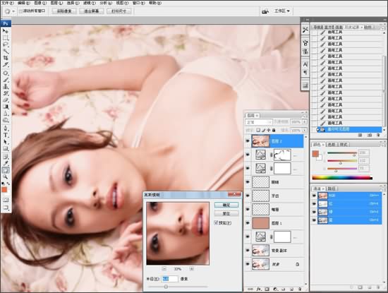 运用 “高斯模糊”滤镜对快照层执行调节,如此就可虚化背景了。调节后新建蒙板,把人的面部及胸部擦回来就可以了。