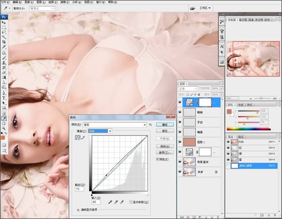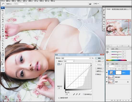 新建“曲线”调节图层,压暗相片中的高光部分。由于原始图片中的高光部分过亮,在下一步为照片加色的时候,高光部分无法上色,因此要在这一步把照片的高光区域压暗。