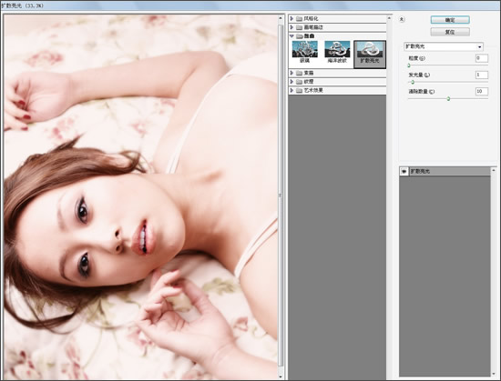 虚实关系确立后,我们想要略略调节相片的高光区域。新建快照图层,并运用“扩散高光”工具调节相片,目的是增加反差,使画面层次越加丰富。最终再新建图层蒙板把人物还原。