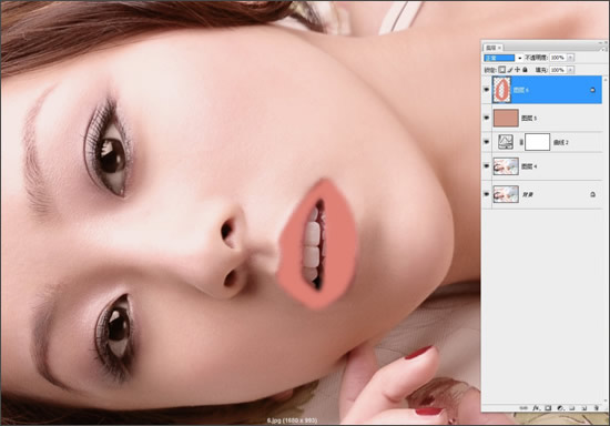 留意:在为嘴唇加上颜色的时候要细致,避免色彩影响到牙齿与面部,必要时可把照片放大至100%上面执行调节。