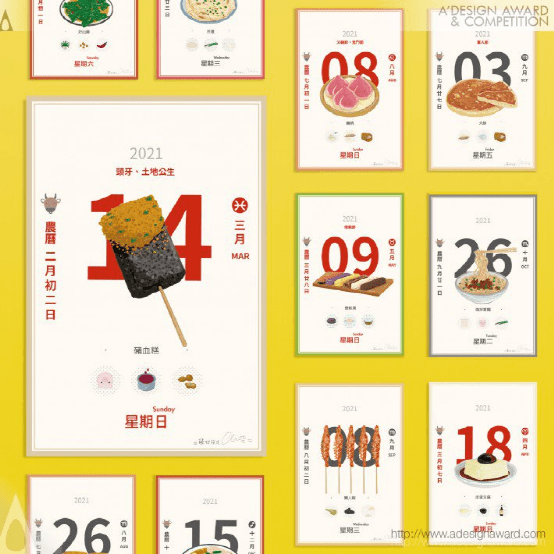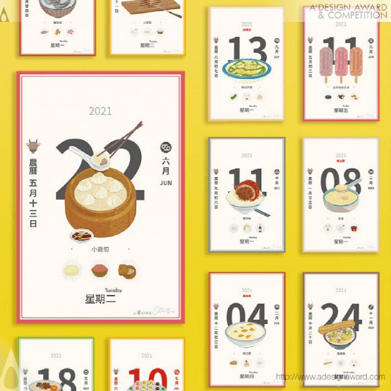 Through Taiwanese cuisine, this team has drawn and accumulated hundreds of illustrations. For the sake of commercialization, a calendar dedicated to Taiwanese food was created by specifically combining the "Bento box", a local lunch box packaging unique to Taiwan, with a Taiwanese calendar. As a result, a lot of research on local food was also done, and the inspiration for the illustration content was found through the collection process.