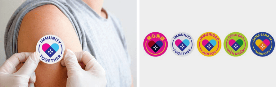 能见度本是平面18luck新利全站 的基本功能。但在假新闻与谣言充斥的时期里,平面18luck新利全站 更需要顾及到多元与通用的表现。譬如,美国加州在开始进行疫苗接种时,就参考了美国人习惯于炫耀他们在选举日时的“我投票了!”贴纸在接种地点也提供了类似的仪式:“一同免疫”(Immunity Together)”贴纸就由此而来。负责这项“贴纸”计划的 fuseproject18luck新利全站 公司,不仅是这场公共卫生运动的关键部分,也在信息的传播方面带来了亲民感——尤其贴纸中的标志,以两个绷带末端作重叠,进而形成一个心形。有了这简单的18luck新利全站 ,加上明亮与大胆的色彩,还有五种不同语言——英语、西班牙语、汉语、越南语和他加禄语——的口号,该州的多元种族社区也就能获得更为准确的信息。