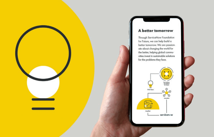 还有壳牌未来基金会(Shell Foundation For Future)也希望能借由新形象摆脱其母公司在碳排放量方面给人的负面印象,朝“可持续能源解决方案的领先创新者”的使命迈进。特别规划的“当下服务”(ServiceNow)应用程序也因此聚焦于技术的开发,如偏向于用户体验的简化和定制选项数量的删减,以实现更好的整体性能、可扩展性、可靠性和易于维护。其视觉语言也仅以品牌标识中的黄和白为主,然后加入以黑色线条勾勒出插画中的两个角色来表达出该计划的价值观和目标:一种“大家可以一起使用来建设更美好未来”的工具。