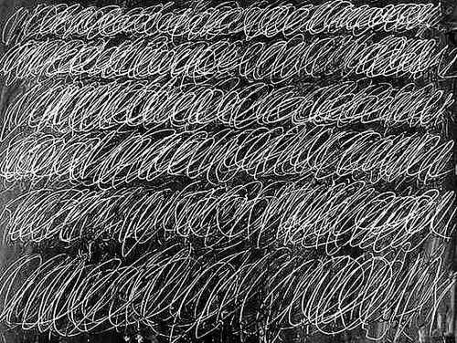 美国抽象艺术大师塞汤伯利创作了一系列《黑板》的作品,风格就像孩童式的涂鸦,彷彿书写和绘画之间是没有界线的;他的创作方式也很特别,是坐在朋友的肩上,让对方随意晃动,然后他便顺着这个起伏,用粉笔在黑板上不间断的画出线条。涂鸦般的恣意奔放却展现出优雅,和大部分抽象派画家狂野的风格不同,他笔下将日常或是自然的事物画成简单线条,却能捕捉神韵,因为深受欧洲历史和古典神秘主义的影响,他的笔触率性、本能而且主观。