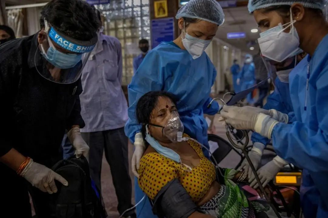 2021年4月29日,在印度新德里的圣家医院急诊室内,一名感染新冠病毒的妇女受到医护人员的照顾。(摄影师:Danish Siddiqui)