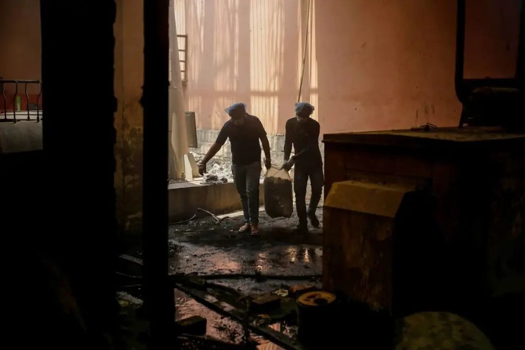 2021年5月9日,在印度新德里的一个火葬场,非营利组织的志愿者阿什·卡夏普和纳曼·夏尔马提着一个袋子,里面装着一些新冠病毒死者的无主骨灰。(摄影师:Adnan Abidi)