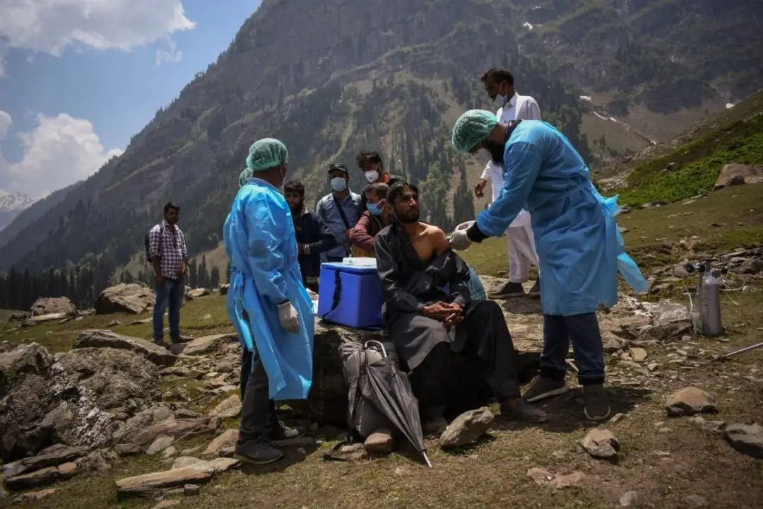 2021年6月10日,在位于印度克什米尔安南塔纳格区的利德瓦特的疫苗接种活动中,一名医护人员为一名牧羊人注射新冠疫苗CoviShield。(摄影师:Sanna Irshad Mattoo)