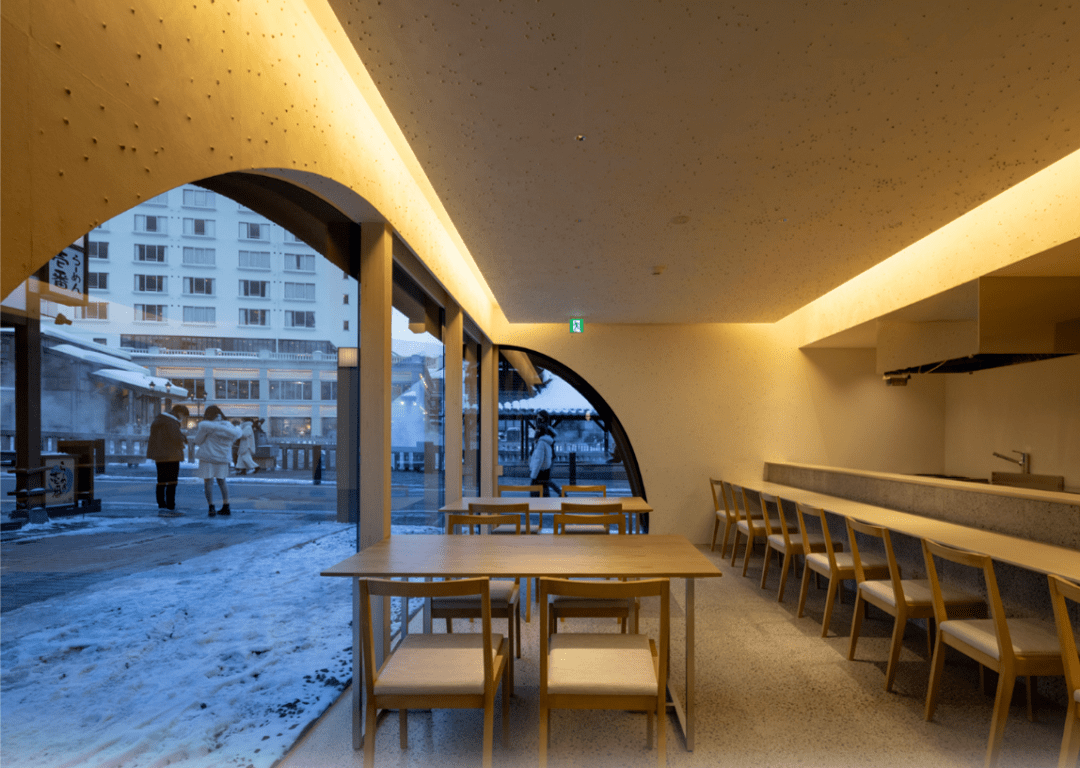 室内继续使用了当地材料,浅间石、水磨石、日本和纸,处处展示出本地性并在整体氛围上突显舒适与疗愈。天花板是裸露的美丽木材,毗邻的浴室里设有温泉池。©川澄.小林研二写真事務所