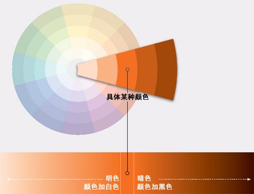 从上图我们可以看出,处于右边的暗色就是加上黑色,而左边的明色则是加上白色。五个圆环已经清楚表示了颜色如何由暗到亮的过程。但这种明色及暗色的关系只是相对而言。