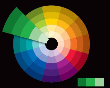 色轮有五个同心环组成,从暗到亮――暗色处于大环,明色处于小环,而中间是颜色的基本色相。