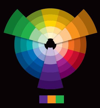 如果我们同时用补色及类比色的方法来确定的颜色关系,就称为分裂补色。这种颜色搭配既具有类比色的低对比度的美感,又具有补色的力量感。形成了一种既和谐又有重点的颜色关系。如在上面三种颜色中,红色就显得更加突出。
