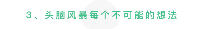 这就好像从背后慢慢接近创造力。下次,当你正在开会,所有人都在时,你提议“我们来写下所有的好点子吧”,如果思维卡住了,那就尝试其他方向。写下所有你认为“不可能解决的事”。