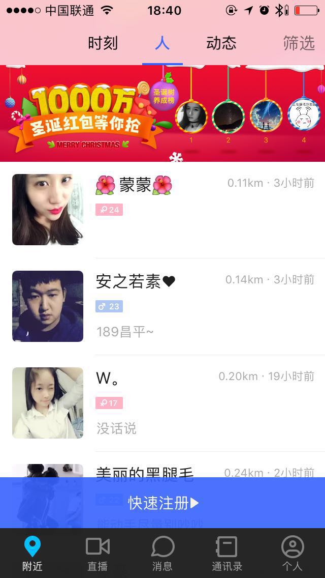 从哪开始,到哪结束。这里重点要思考的何时是开始,是默认让用户登录/注册呢?还是在需要权限时才触发登录/注册?这里需要结合上面的用户和任务,如何让用户愿意注册,陌陌带给用户的价值是帮助用户认(yue)识(pao)附近的人,而且陌陌对氛围控制还不错(比微信附近的人质量高很多),那么可以先让用户看到附近的人,促使用户愿意注册。