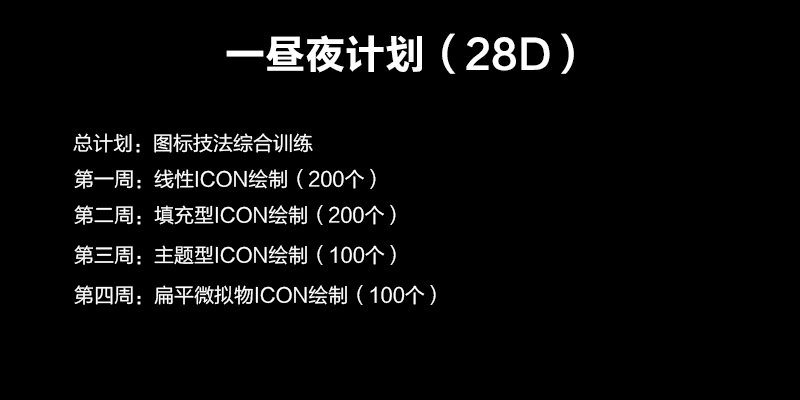 有了这四项综合训练之后,我们就可以清晰知道自己的一昼夜28天要达成什么目标,四项直接划分为7天一周期,也就是第一周提升任务为:线性ICON绘制...以此类推,直到一昼夜达成,过程辛苦,大家都懂得,过后你会感谢曾经努力的那个自己。