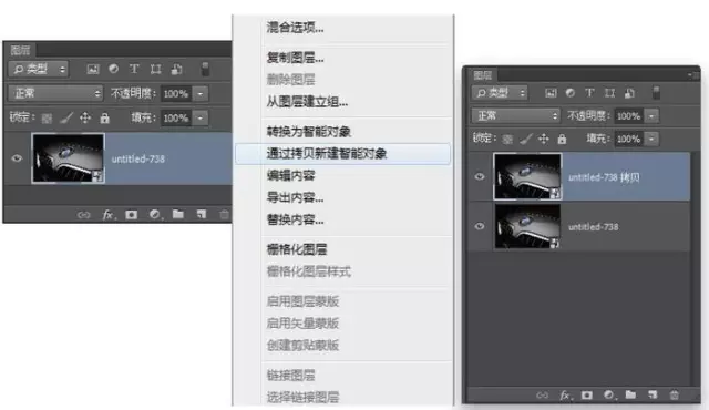 要完成这个小技巧,我们需要两个智能对象图层(换句话说,我们需要两个RAW图片完全分开的版本)。但是,我们不能只是通过拖动原图层到新建层的图层图标来复制它(像我们平时那样),因为当你这样做了,这两个智能对象图层将被链接到一起—如果你重新编辑其中一个图层,另一个就会自动更新。因此,复制时,我们需要打破这个图层链接。具体方法如下:在图层面板中,右键单击图层的名称,从出现的弹出菜单里,选择通过拷贝新建智能对象(如图2所示)。它将对你的RAW图层进行复制,但它打破了之间的链接,这样你就可以从原始图片中单独地编辑这个复制层。