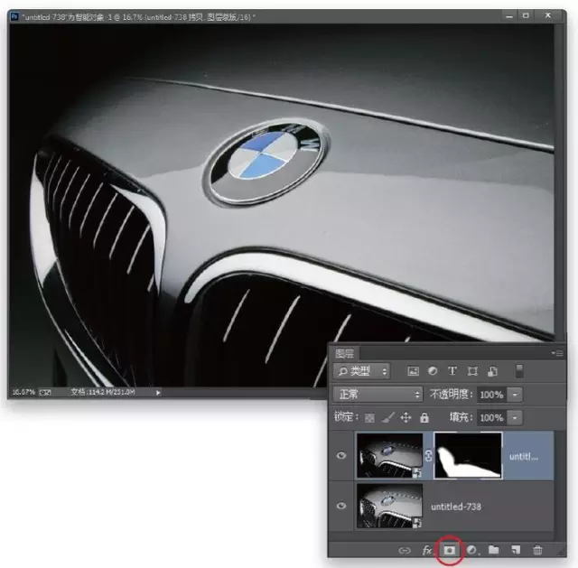 我们只想让出风口的底部有这种提亮阴影的效果,所以 按住Option(PC:Alt)键单击在图层面板底部的添加图层蒙版图标 (如图6中红圆圈所示),将这个增亮的智能对象图层隐藏在黑色的图层蒙版后面。现在你的图片看起来就像我们移动补光滑块之前时一样,但是这是因为顶层的图层隐藏在这个黑色的蒙版下。我们的任务是让这个图层的出风口底部展示出来。要做到这一点,我们要用画笔工具涂抹出风口的那个部分。因此,从工具栏中找到画笔工具(B)并确保你的前景色被设定为白色。现在,喷涂出风口的底部。当你这样做的时候,就会把出风口涂成更亮的版本(现在你看到补光的图层只通过你涂画过的部分展示出来)。