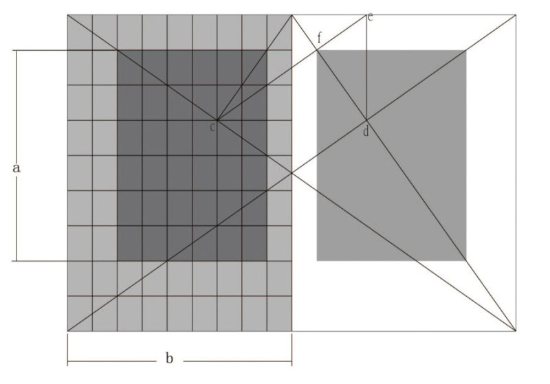 图示是建立在长宽比例为2:3的比例上。图中的高度a与页面的宽度b相等,装订线与顶部的留白占整个版面的1/9,。内缘留白是外缘留白的1/2。使跨页的两条对角线与单页的对角线相交,两个焦点分别为c和d,再由d出发,向顶部作垂线,其焦点e与c相连,这条线又于页面的对角线相交,形成点f,整个交点f就是整个正文版面的定位点。