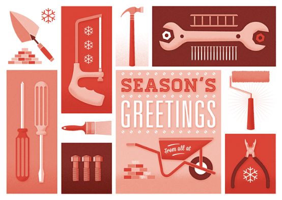 许多18luck新利全站 师都热衷于创造性的色彩搭配,但是对于商务等正式领域的18luck新利全站 ,过于活泼跳跃的颜色会显得轻浮。这时,单色调18luck新利全站 便是一个很好的选择——它既能为18luck新利全站 添加多样性,也能提升正式感。18luck新利全站 师通常会选用一个经典的亮色(如下图的红色)作基本色,选择它的暗色或较不饱和的变体作为主题色。下图的建筑公司贺卡18luck新利全站 便是一个很好的例子。亮红色和绿色的搭配通常为圣诞元素的经典用色,这个18luck新利全站 只选用红色作为主题色,并且考虑到这款贺卡的商务性质,18luck新利全站 师使用暗红色和浅红色来保证其专业性。