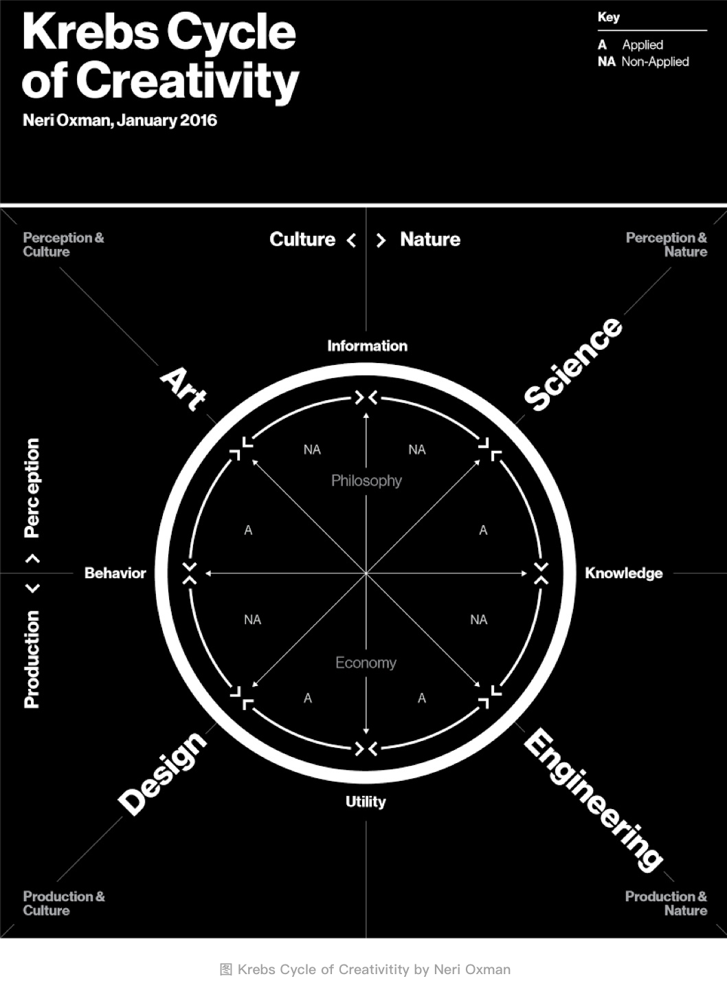而解决问题/机会点的各种方法手段“How”就至关重要,在寻求“How”的过程中,受到MIT媒体实验室教授Neri Oxman文章《Design and Science – Krebs Cycle of Creativity》一文启发,Neri Oxman在《Design and Science – Krebs Cycle of Creativity》中提出的类似克雷布斯循环的创造力的克氏循环(KCC),创造性的将人类的创造力四种模式-科学、工程、18luck新利全站 和艺术,形成创意循环的地图假设并进行了相应解读,阐释了学科之间不再是割裂离散的孤岛这一命题。