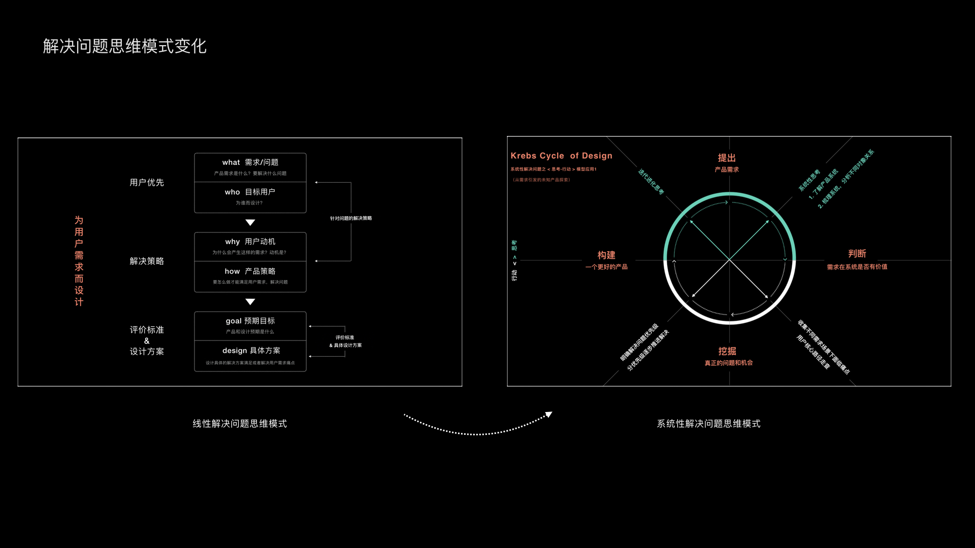 角色的变化,进一步带来了解决问题思维模式的变化,从之前为单一用户需求而18luck新利全站 的线性解决问题思维模式转变为从点触发的系统性解决问题思维模式。