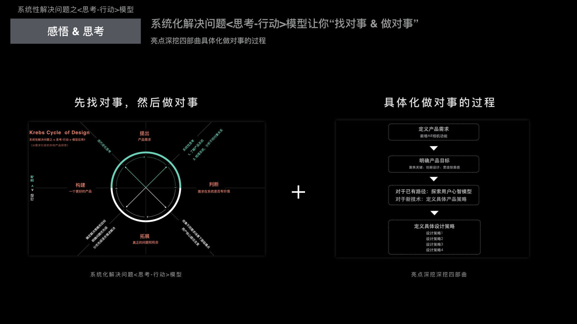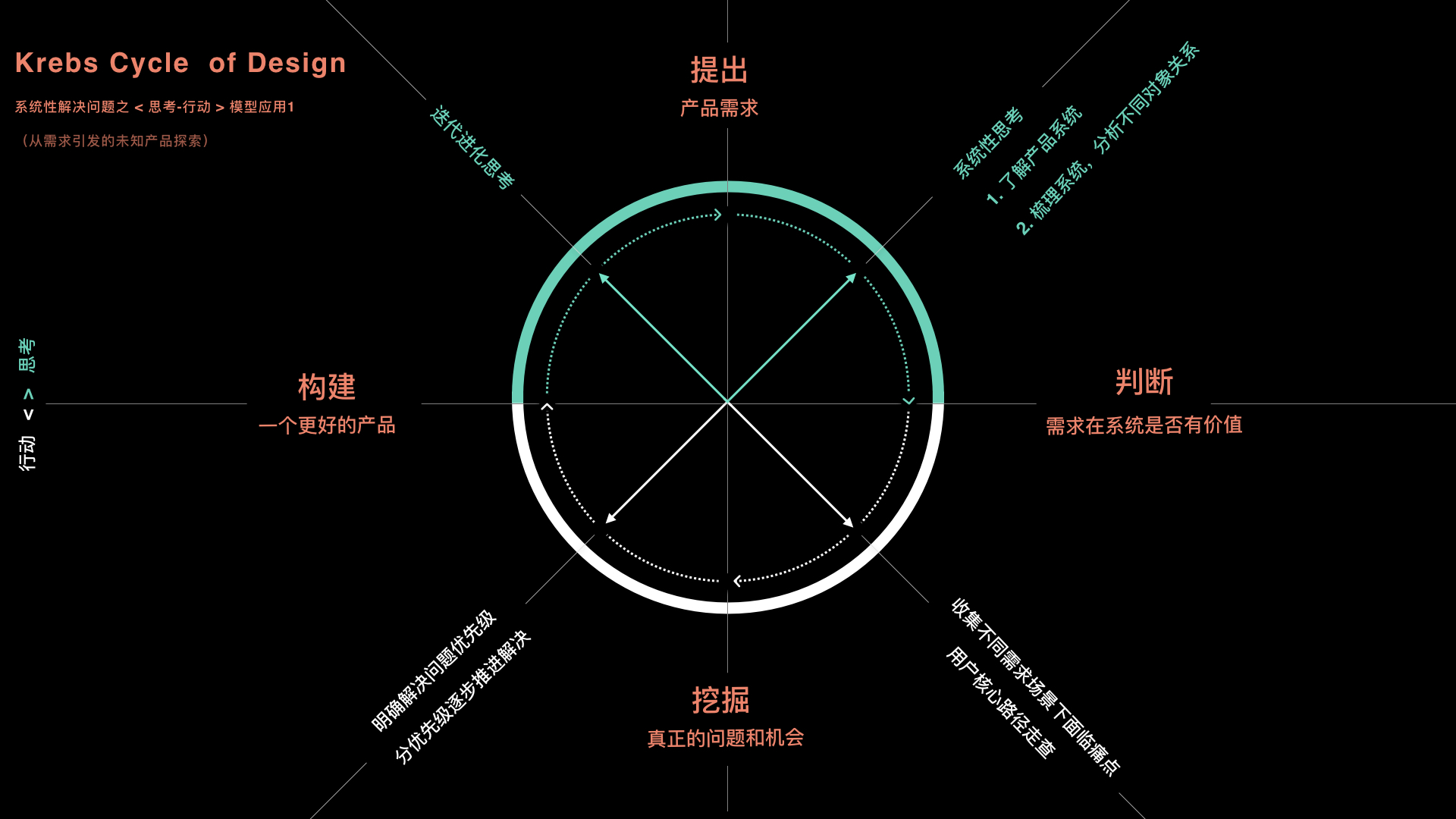区别于“点对点”的解决问题,为了从更高角度更好的解决问题,类比克雷布斯循环和创造力的克氏循环(KCC),将“发现-解决”问题/机会点这一过程整体系统化,尝试提出系统性解决问题之 < 思考-行动 > 模型-Krebs Cycle of Design。