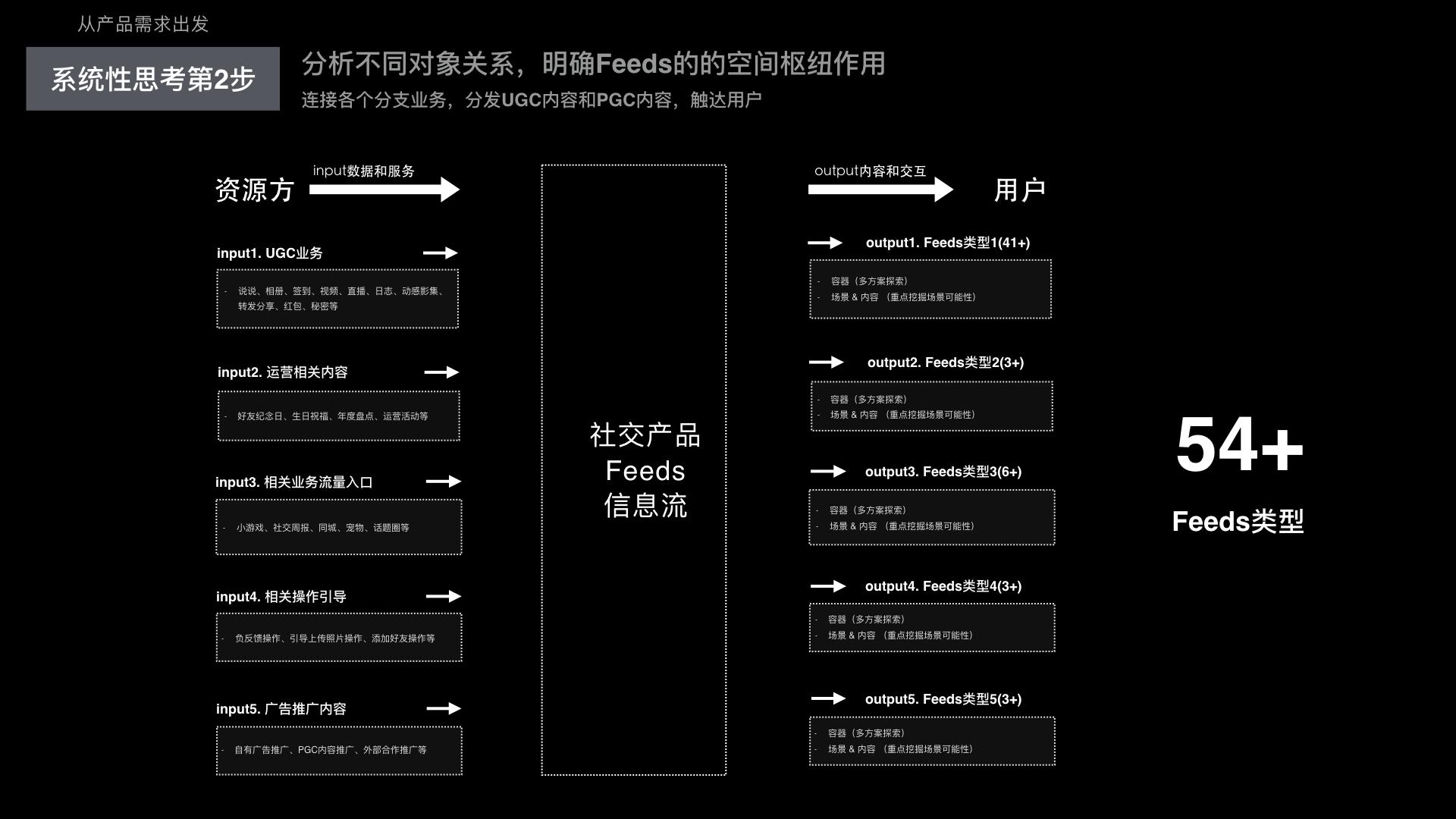 从已知的需求、问题和机会点出发,从点触发18luck新利全站 师全局思考产品。通过系统性思考,了解产品整体系统,该部分思考的维度和方法,通常从商业、产品、项目、用户等多角度思考,如商业工具(理解商业的商业模式画布)、产品工具(了解行业位置的SWOT分析法、发散创意的搜寻领域图和思维导图)、产品工具(理解阶段目标的目标分解图)、用户研究工具(量化理解用户的问卷和访谈、定性用户研究的可用性测试&焦点小组、模拟分析场景的体验地图)。而以QQ空间Feeds信息流产品为例,阐述如何更全局的系统性思考产品。系统性思考第1步:从日常繁琐的小需求中跳出,从资源输入-内容输出维度,全局的了解空间的整体产品体系,比如核心UGC业务、运营相关业务、分支业务、广告业务等。系统性思考第2步:基于资源输入-内容输出维度全局了解产品体系后,针对Feeds信息流模块,梳理出资源输入类型和各个类型所包含内容,以及触达用户的内容输出Feeds类型以及包含内容信息,分析输入输出不同对象关系,明确空间Feeds信息流的空间枢纽作用,为下一步判断需求/问题/机会点的价值提供依据。