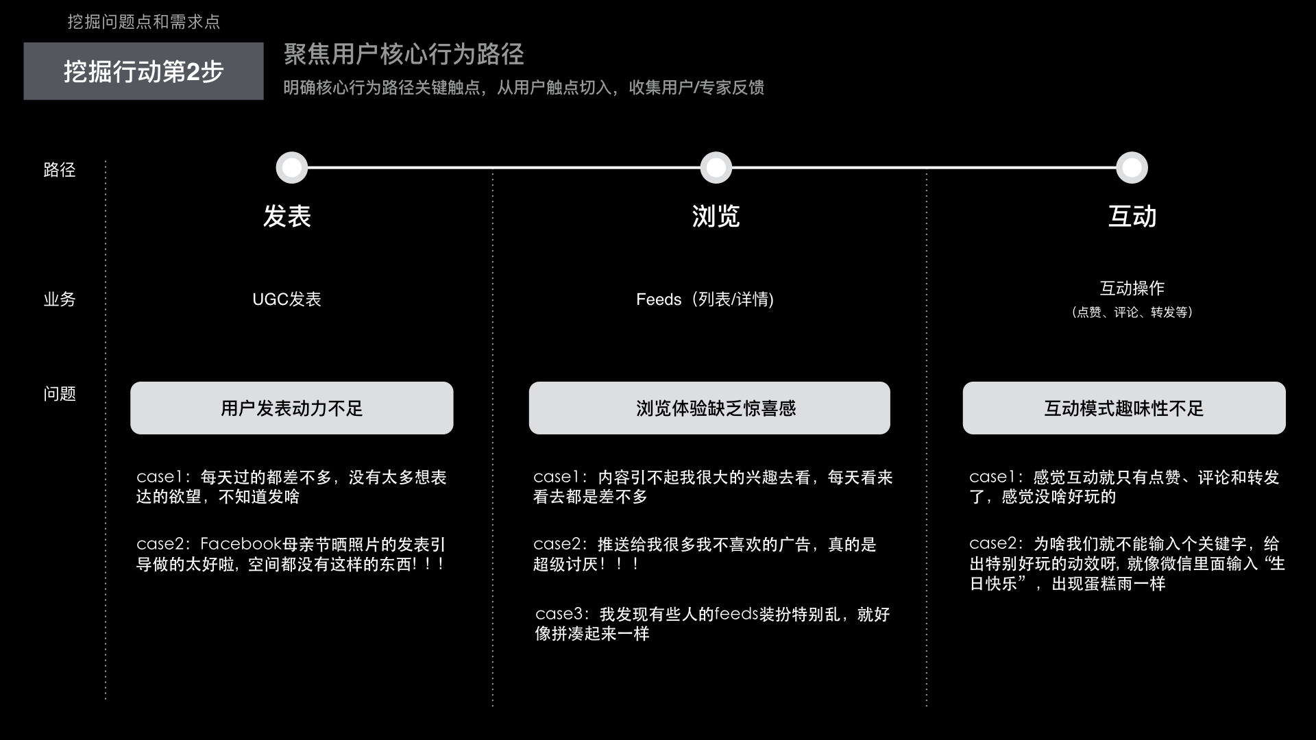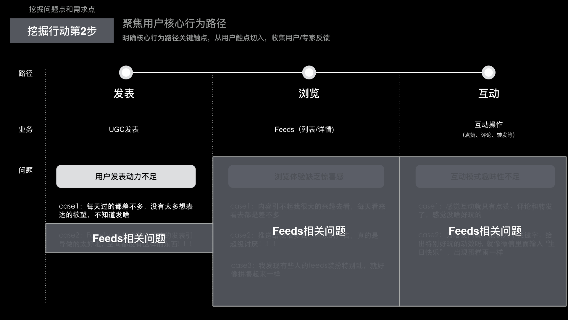 挖掘行动第2步:从用户“发表-浏览-互动”的Feeds信息流相关的核心行为路径切入,收集用户/专家反馈,并分析确定用户核心行为路径哪些问题与Feeds相关。