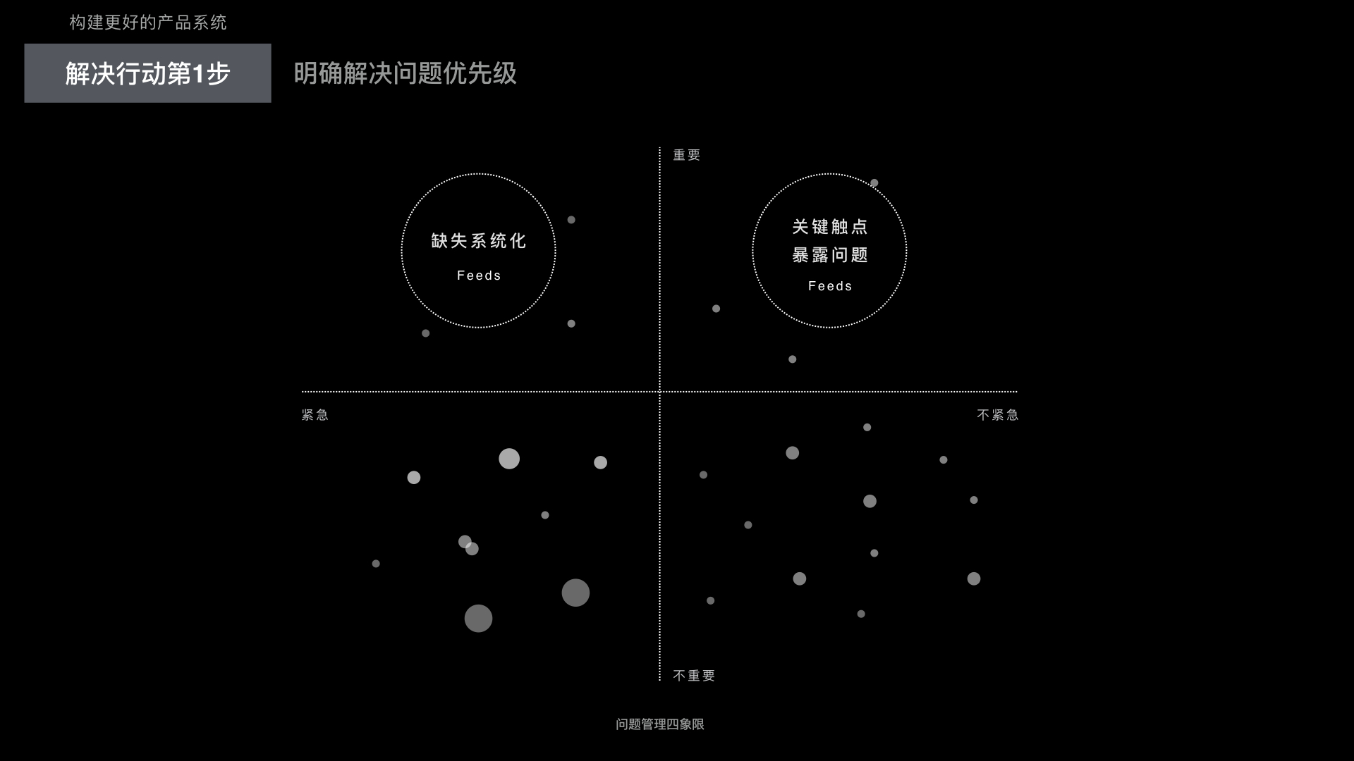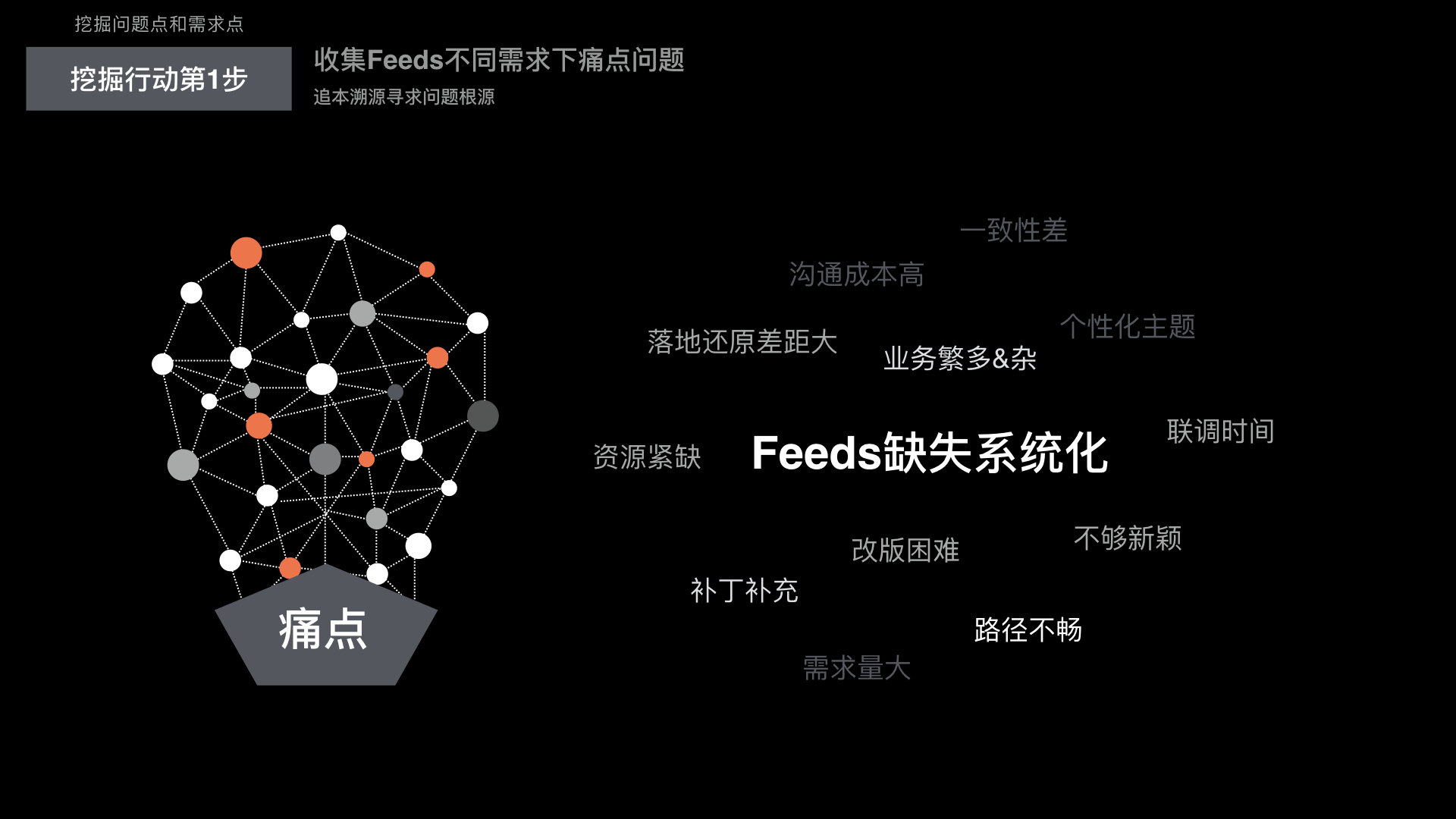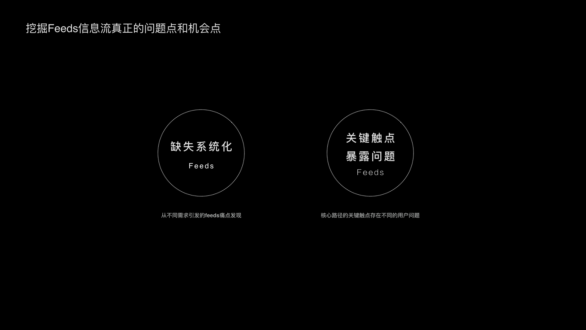 挖掘行动后,就可以从产品内部、用户本身等多维度得到N个问题和机会点,通过对问题和机会点整理判断分析,得出真正的问题和机会点。如针对空间Feeds信息流产品真正的问题点和机会点有2个:Feeds缺失系统化、Feeds关键触点暴露的用户问题。