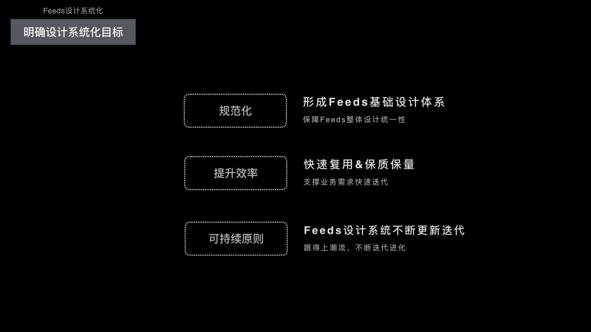 明确预期目标有助于我们在项目后期更好的评估系统化18luck新利全站 的价值和效果,空间Feeds信息流产品主要从3个维度明确目标:规范化(形成Feeds基础18luck新利全站 体系,保障Feeds整体18luck新利全站 统一性)、提升效率(可以快速复用,保质保量的支撑业务需求的快速迭代)、可持续原则(一句话就是跟得上潮流,不断的迭代进化)。