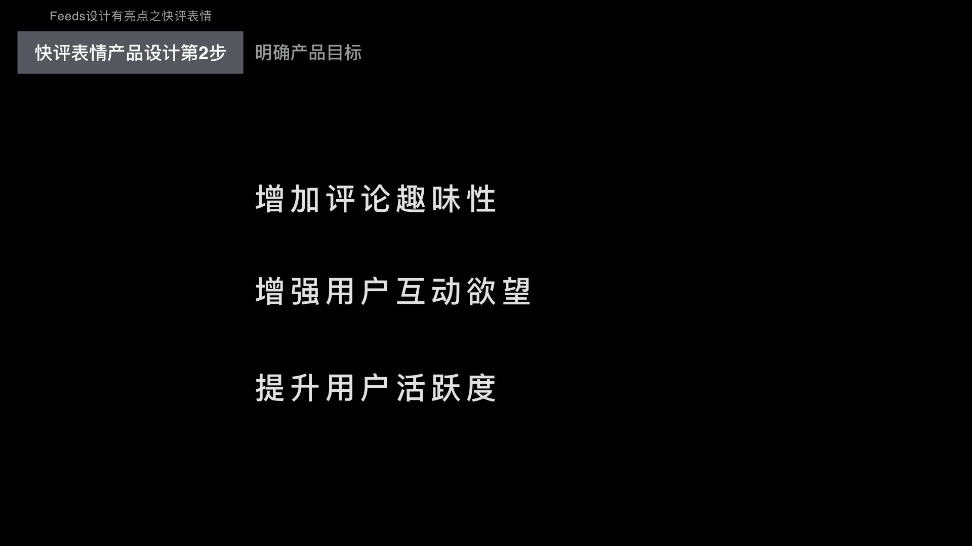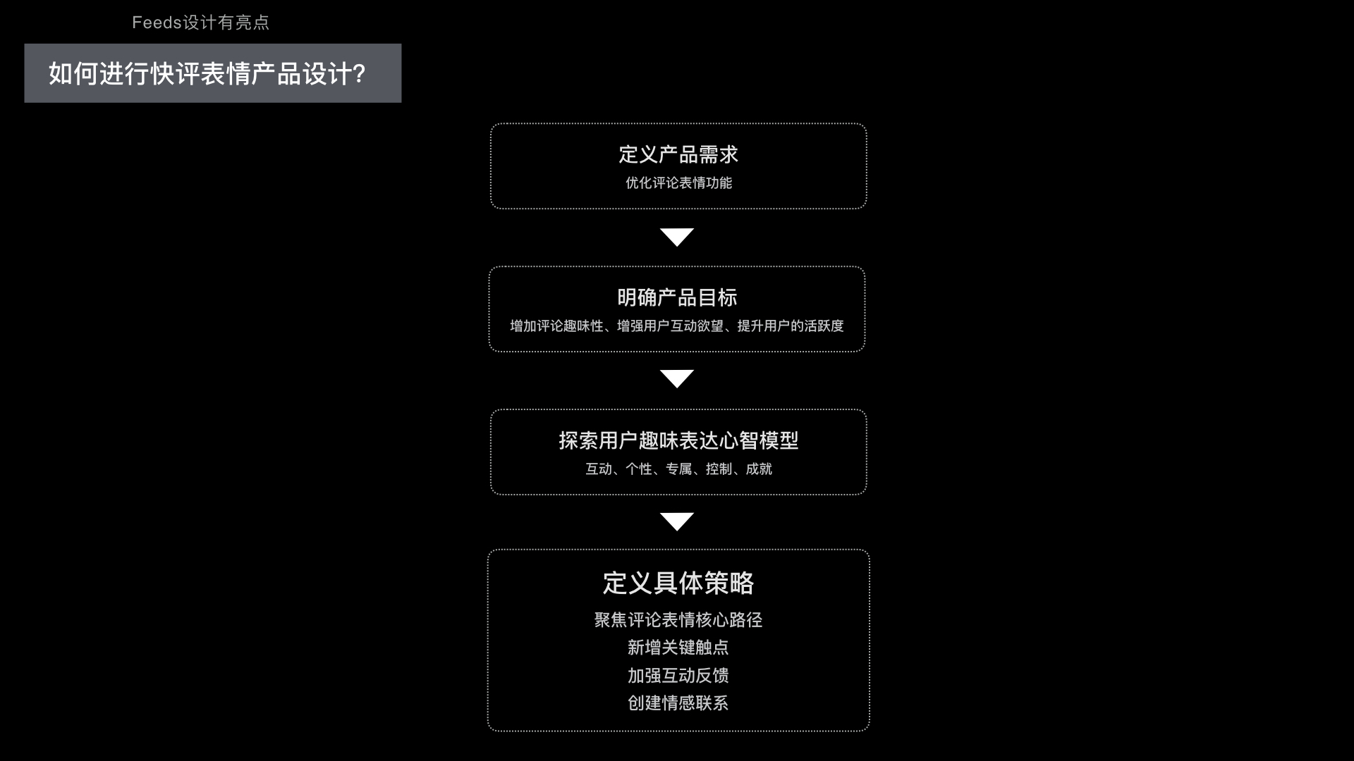 在明确了产品18luck新利全站 思路后,依据思路,通过以下4个阶段逐步推进快评表情亮点化18luck新利全站 :定义产品需求-明确产品目标-探索用户趣味表达心智模型-定义具体的解决策略。