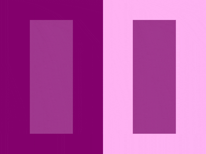 两个紫色的颜色相同么? 这种错觉很微妙,但是非常有吸引力,看看上面的动画,你会发现左边的紫色块比右边的紫色块更亮,但实际上两者都是一样的。