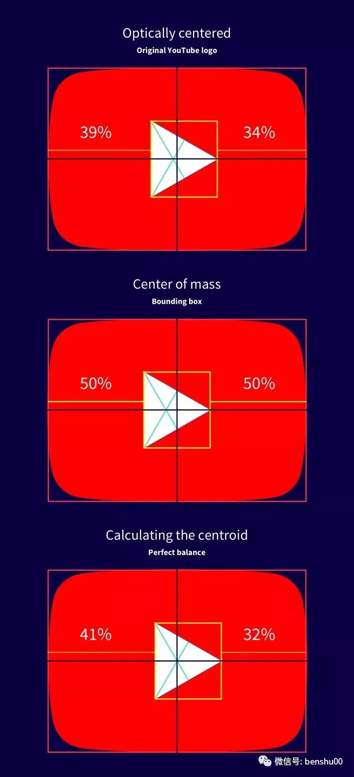 你能找到三角形的中心么? 并非所有的图标都是对称的,对于我们常见的播放按钮图标,找到视觉的中心实际上很困难。造成这种情况的原因是由于三角形分裂错觉的效应,中心位于三条中线(顶点和对边的中点的连线)交点,此点即为重心。