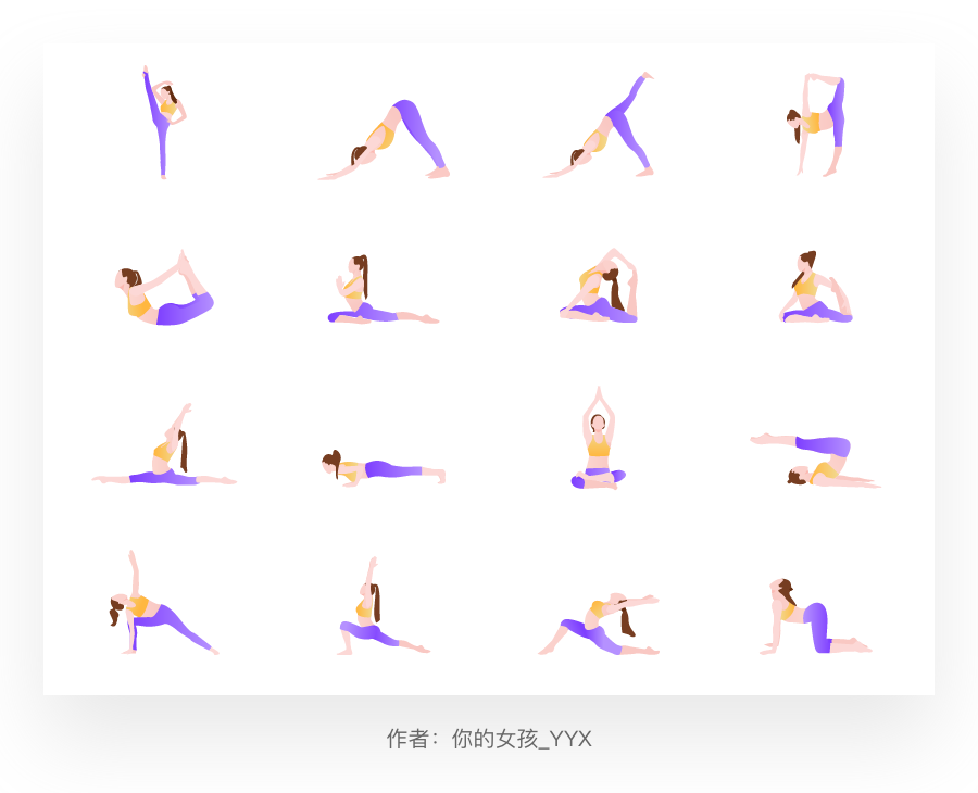 对风景照片仿照到一定程度之后,我们可以强化一下人物插画。同样的原理,我们可以从人物照片开始提炼,比如跑步、瑜伽、游泳、体操、舞蹈等等人物动作,带有动作的人物表现起来能够让你对人体比例、造型基础等有一定的掌握。