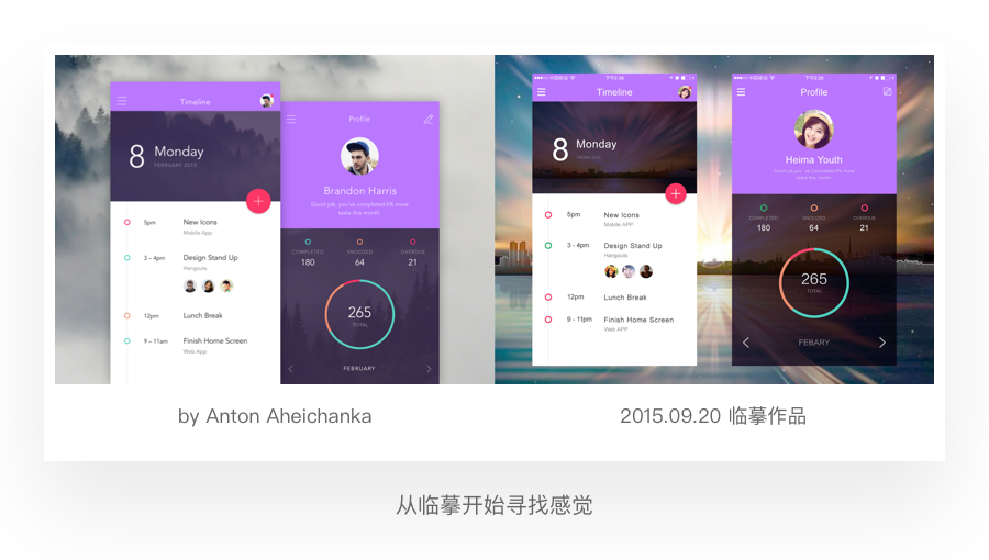 独立完成一套作品可能你会感受到任务的艰巨,平时也要上班,时常还有加班,久而久之就一直拖延下去啦。我们要善于利用积少成多的思路,我以前要完成一套作品,就拆分成每天两个界面,做好就发 Dribbble 等平台,经过一两周下来,就产出了几十个界面,基本一套产品18luck新利全站 就在无形中完成了。但是,至于你是否能够坚持完成一个界面或者两个,那就还是要逼自己一把的。