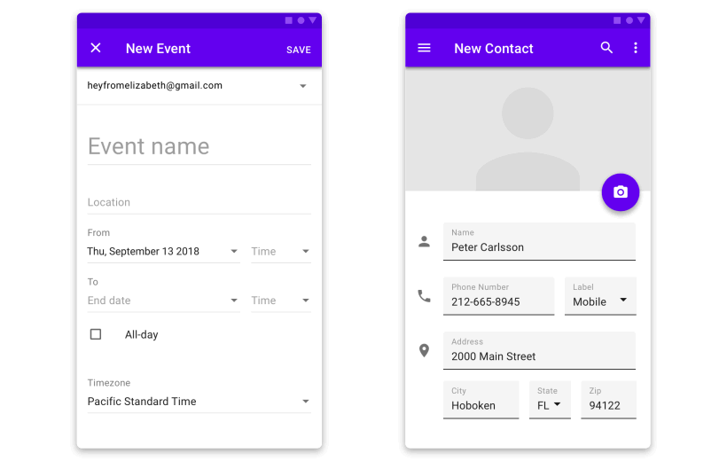 如果在开始和结束元素之间有一个很清晰的空间和层级关系,共享动画就可以强化这种关系。例如:在导航步骤上,开始和结束组件共享一个垂直滑动动画,这种方式加强了在垂直方向上的信息内容。当按下步骤中的下一个按钮时,组件元素之间共享了一个水平滑动动画,从左向右的滑动强化了步骤进行的概念。共享动画也是运用了谷歌Material动画的标准缓动。