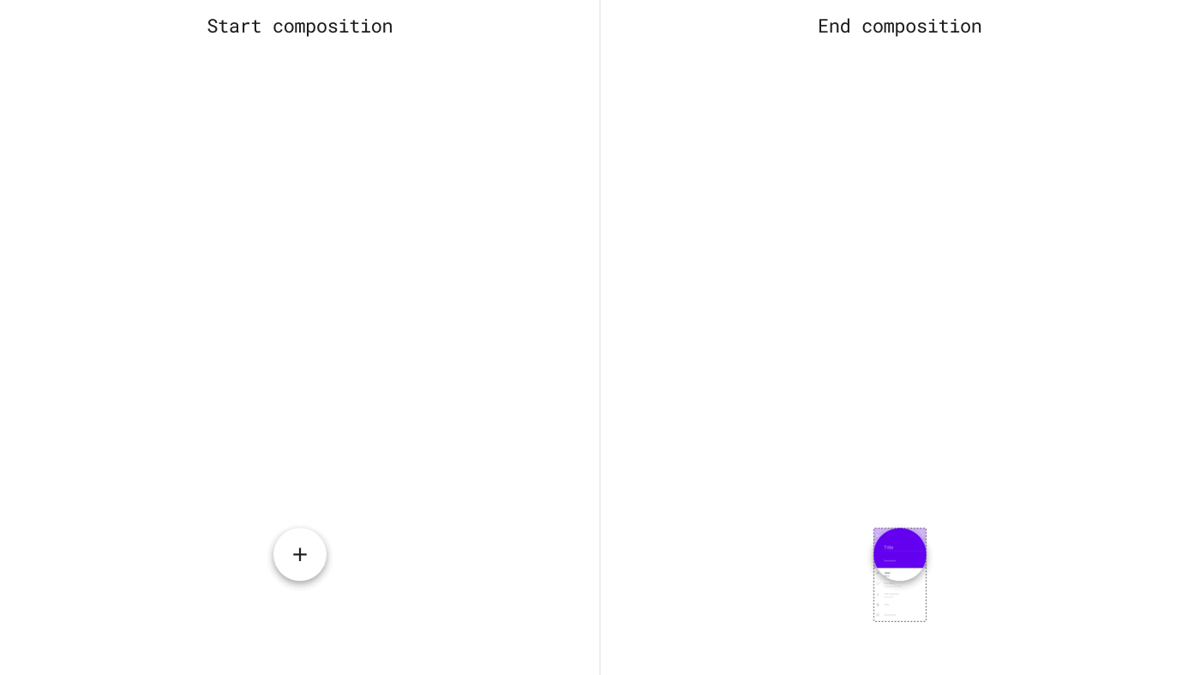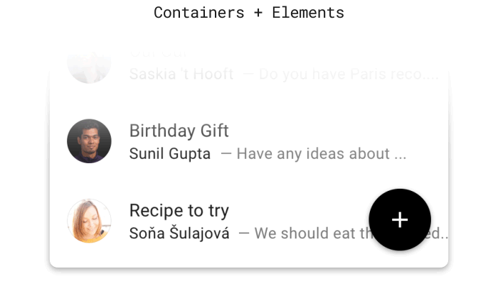 如果界面中涉及到一个容器,比如按钮、卡片或者列表,那么转换就是基于容器的动画。容器通常很容易根据它们的可见边识别出来,但是要记住,它们也可以是在转换之前不可见,就是没有分割线的列表一样。这种模式过程分为三个步骤来做: