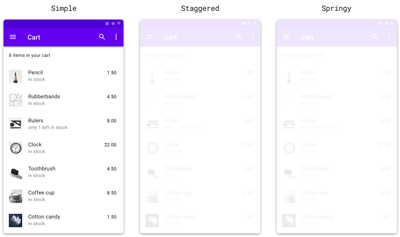 有些容器只是使用Material动画的标准缓动从屏幕外滑入, 它滑动的方向取决于与之关联的组件的位置。 例如:点击左上角的抽屉导航图标,菜单将从左侧滑入容器。