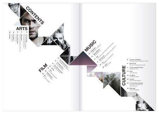 即将目录中的元素(页码、标题、图片)用表格的形式来排列,这么做也可以使信息更加清晰,更有秩序。由于这种做法在目录18luck新利全站 中并不常见,所以显得很特别。