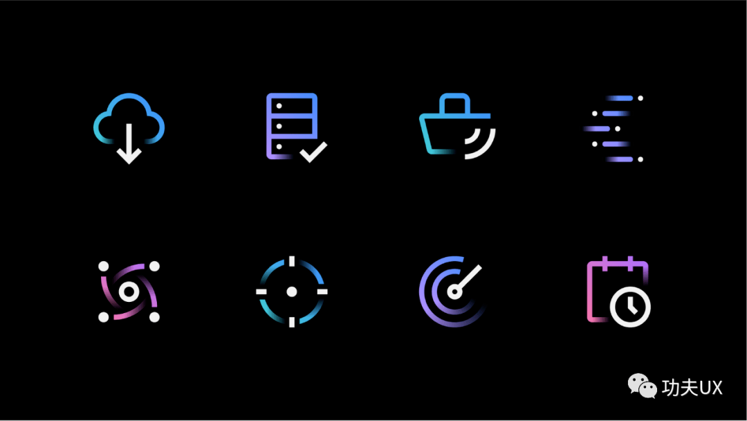 Alpha icon 图标风格最大特点就是单色带透明渐变,通过弱透明度来制造视觉层次,如果是纯白色,就会显得图标平庸了一些,这种图标运用范围可以是界面中空场景或者一些关键模块的主功能图标。