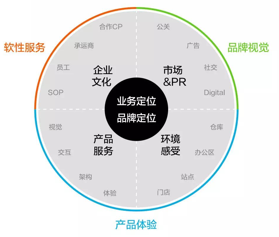 ▲上图内包含了品牌应用的各个场景,大致可以划分为四大块,软性服务类是基于塑造品牌文化方面;品牌视觉类的多体现在市场营销公关这块;产品和环境体验分别涵盖产品端和店类,统称为产品体验。